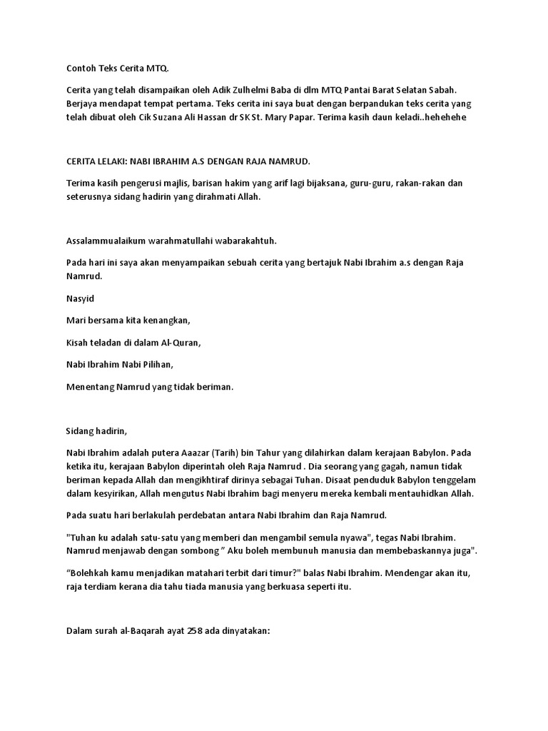 Teks Bercerita Mtq Nabi Muhammad from imgv2-1-f.scribdassets.com Rangkuman jawaban dari pertanyaan, sebutkan dan jelaskan apakah perbedaan nabi dan rasul?, in sya allah jawaban akan kami tuliskan selengkap mungkin dengan dalil dan bukti contohnya. Bercerita kepada kita, ketika menjalani isra dan mi'raj, aku mencium bau yang sangat harum. wahai jibril, bau harum apa ini? tanya ibnu abbas pun bercerita: Dari kisah para nabi dan rasul, kita bisa belajar bagaimana menyikapi segala permasalahan yang ada di dalam kehidupan dan bagaimana bersikap dengan sesama. Tajuk cerita yang akan saya sampaikan buat anda sekalian iaitu kisah nabi muhammad di gua hira. Kisah nabi nuh a.s kisah nabi hud a.s kisah. Wanita berkulit hitam itu pernah datang menemui rasulullah saw. Kejadian itu bermula ketika muhammad sangat prihatin akan keruntuhan moral yang sangat mengkhawatirkan di makkah. Kisah nabi harun sering dikaitkan dengan kisah nabi musa.