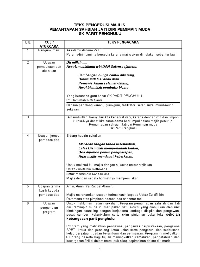 Teks pengerusi majlis masa perkara 8.00 pm. Faridah binti omar, penolong kanan pentadbiran, en. Bagi memastikan majlis berjalan dengan lancar, hadirin diingatkan agar mematikan atau memastikan telefon bimbit berada dalam pengaturcaraan senyap. Berikut adalah teks pengacara majlis, mc untuk majlis sambutan maulidur rasul peringkat sekolah menengah dan rendah. So please help us by uploading 1 new document or like us to download