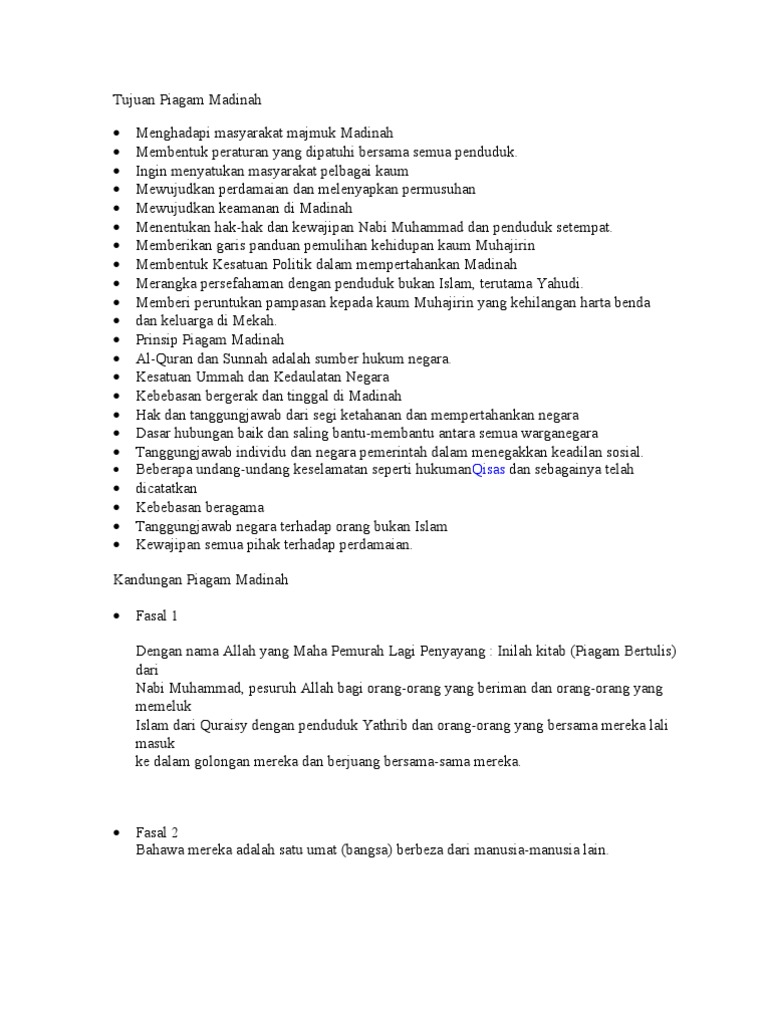 Piagam madinah ini secara lengkap diriwayatkan oleh ibn ishaq (w. Pasal 43 sungguh tidak ada perlindungan bagi quraisy (mekkah) dan juga bagi pendukung mereka. Kaum yahudi beserta kaum muslimin wajib turut serta dalam peperangan. Kandungan piagam madinah politik f1 nabi muhammad sebagai pemimpin. Kandungan piagam madinah terdiri daripada empat puluh tujuh (47) pasal.